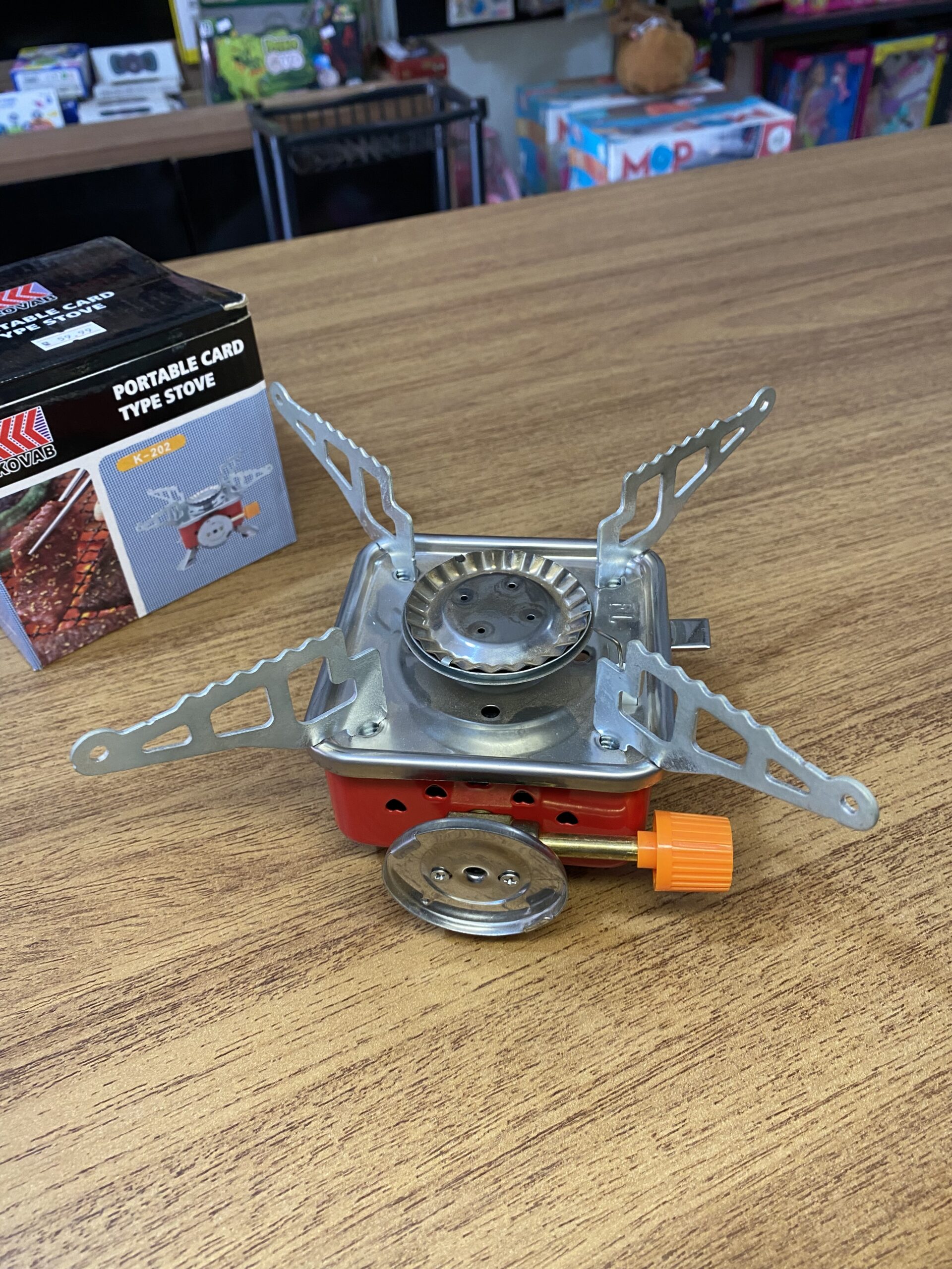 Design e Estrutura: Possui um corpo principal quadrado na cor vermelha com uma base metálica. O grande diferencial são suas hastes de suporte dobráveis (em metal prateado), que se abrem para acomodar panelas e se fecham para facilitar o transporte.