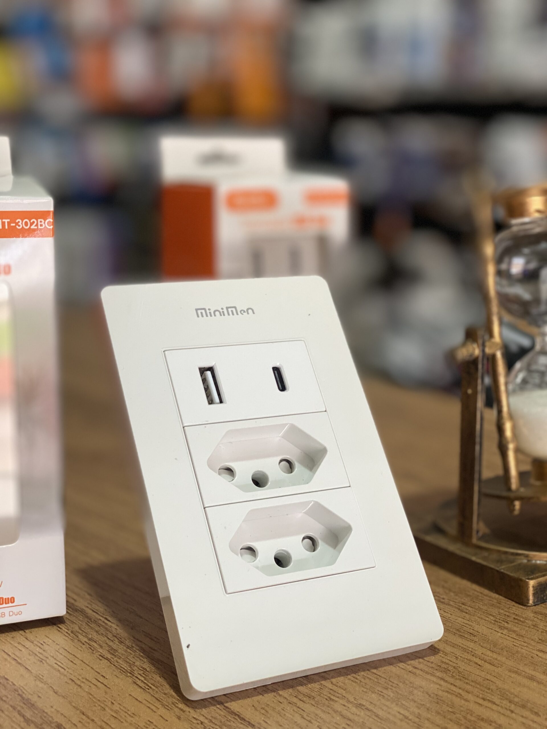 • Duas portas USB na parte superior (sendo uma USB-A e uma USB-C) para carregamento direto de dispositivos móveis.